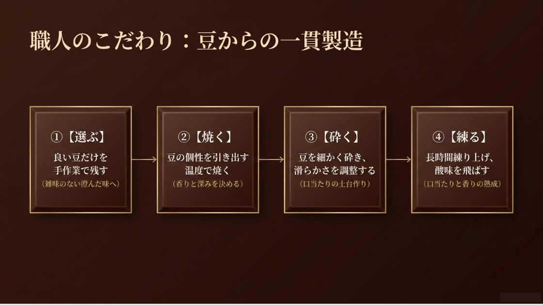 チョコレートの真の美味しさを追求する上で、今や欠かせないキーワードとなったのが「ビーントゥバー(Bean to Bar)」です。これはカカオ豆(Bean)の仕入れから、焙煎、粉砕、練り上げ、そして板チョコの成形に至るまでを、すべて自社工房で行うスタイルのことを言います。