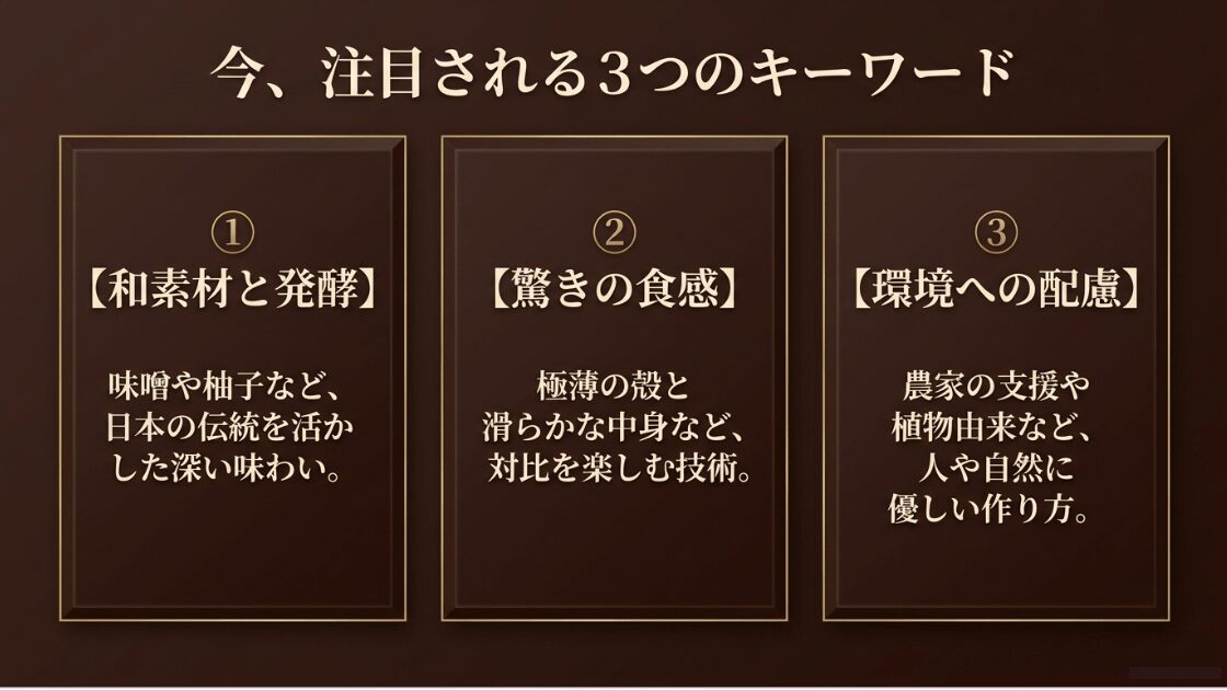 最近のトレンドをチェックしてみると、素材にこだわったビーントゥバーや、日本ならではの和素材を活かした新作、さらには環境に配慮したサステナブルなブランドなど、魅力的なキーワードが次々と登場しています。