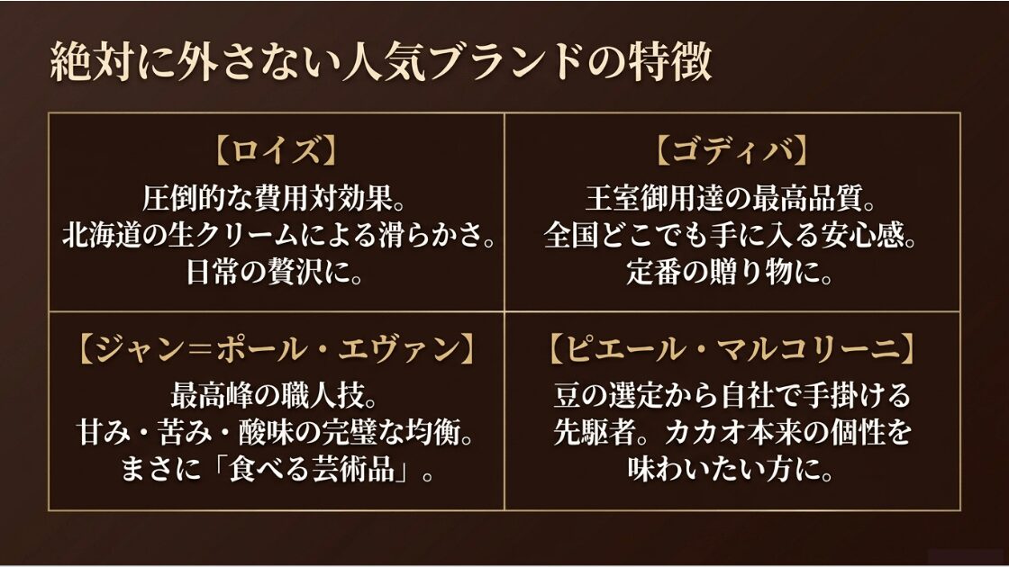これらのブランドは、どれを選んでも間違いがないという共通の安心感があり、初めて高級チョコを手に取る方にも自信を持っておすすめできます。