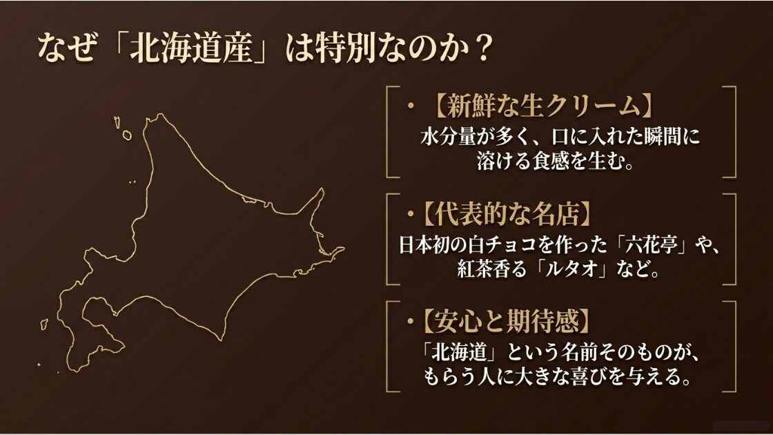 チョコレートの原料であるカカオは熱帯の産物ですが、それを製品として昇華させる過程で乳製品の質が勝敗を分けます。北海道産の生クリームは水分含有量が高く、それがロイズの生チョコのようなとろける食感を生み出すのです。