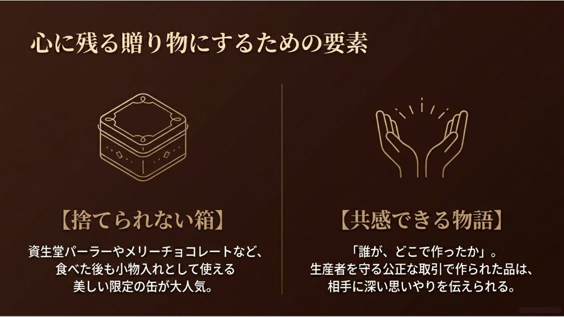 チョコレートギフトにおいて、パッケージデザインは美味しさへの期待値を決定付ける非常に重要な要素です。最新トレンドでは、食べた後も大切に残しておきたくなる「アフターユース缶」が空前のブームとなっています。