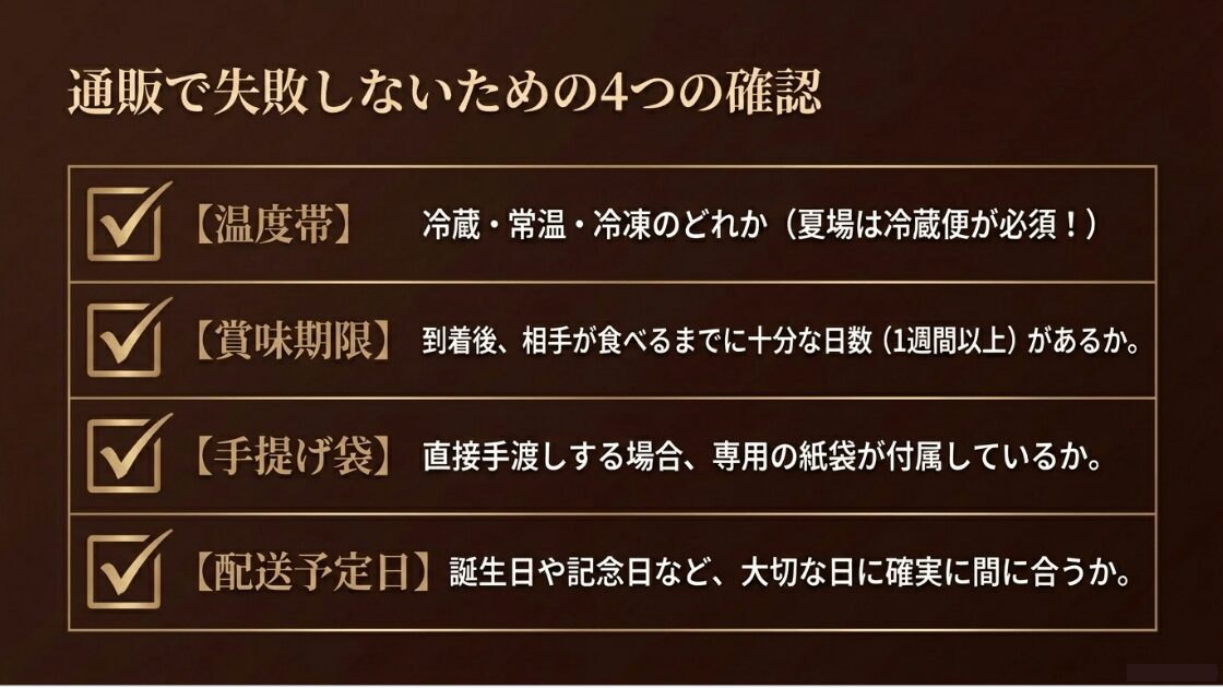 お取り寄せをする際は、配送時の温度管理が徹底されているか、そして何より、相手の手元に届いた時の状態を想像して選ぶことが大切です。