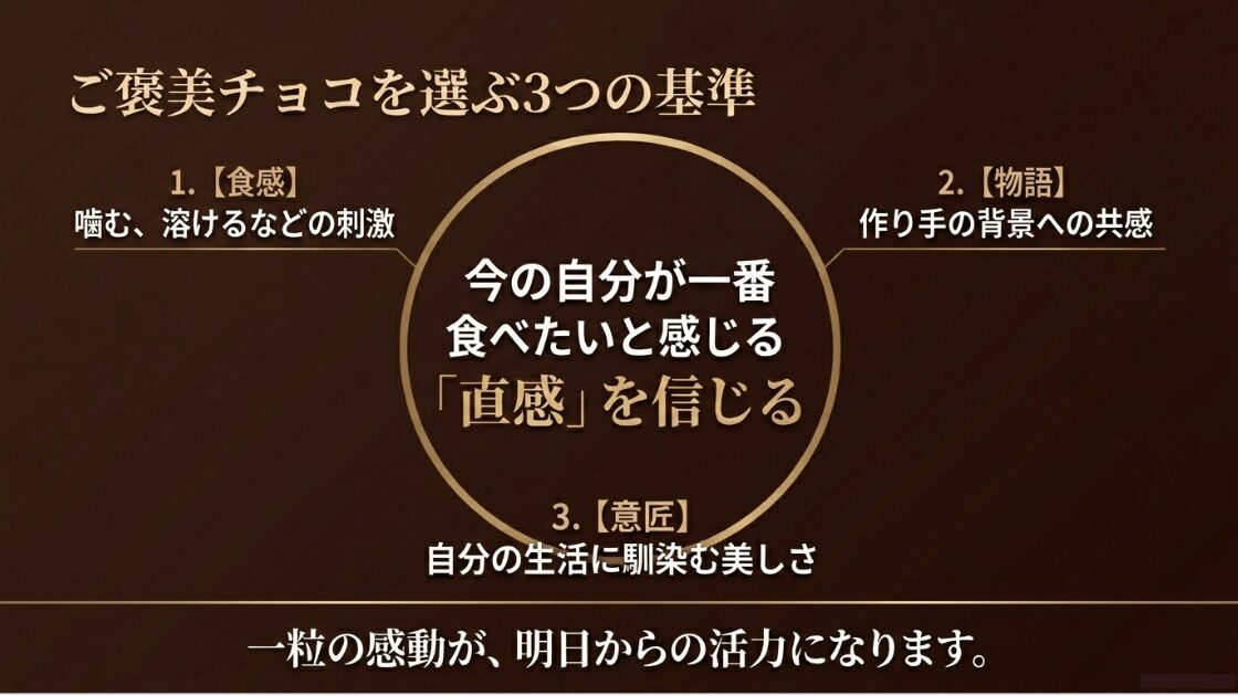 現代において、最高に美味しいチョコレートに出会うためには、自分の味覚の好み(ミルクの甘み、カカオの酸味、あるいは意外な和素材の驚きなど)を大切にしつつ、そのブランドが持つストーリーや情熱に目を向けてみることが近道だと思います。